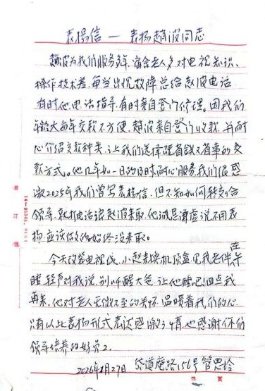 事實(shí)上,早在2024年,這位用戶就曾寫(xiě)下表?yè)P(yáng)信,想要表達(dá)對(duì)他無(wú)私付出的謝意。但由于不清楚表?yè)P(yáng)信的遞交流程,老人們特意打電話請(qǐng)趙波前去取信??哨w波為人誠(chéng)懇謙虛,反復(fù)勸說(shuō)推辭:“服務(wù)用戶是我分內(nèi)之事,不用特意表?yè)P(yáng)?!敝?,便始終沒(méi)有前去領(lǐng)取。這份不張揚(yáng)、重實(shí)干的低調(diào)與務(wù)實(shí),不僅沒(méi)有讓老人們的感激之情淡化,反而更添了一份敬佩。